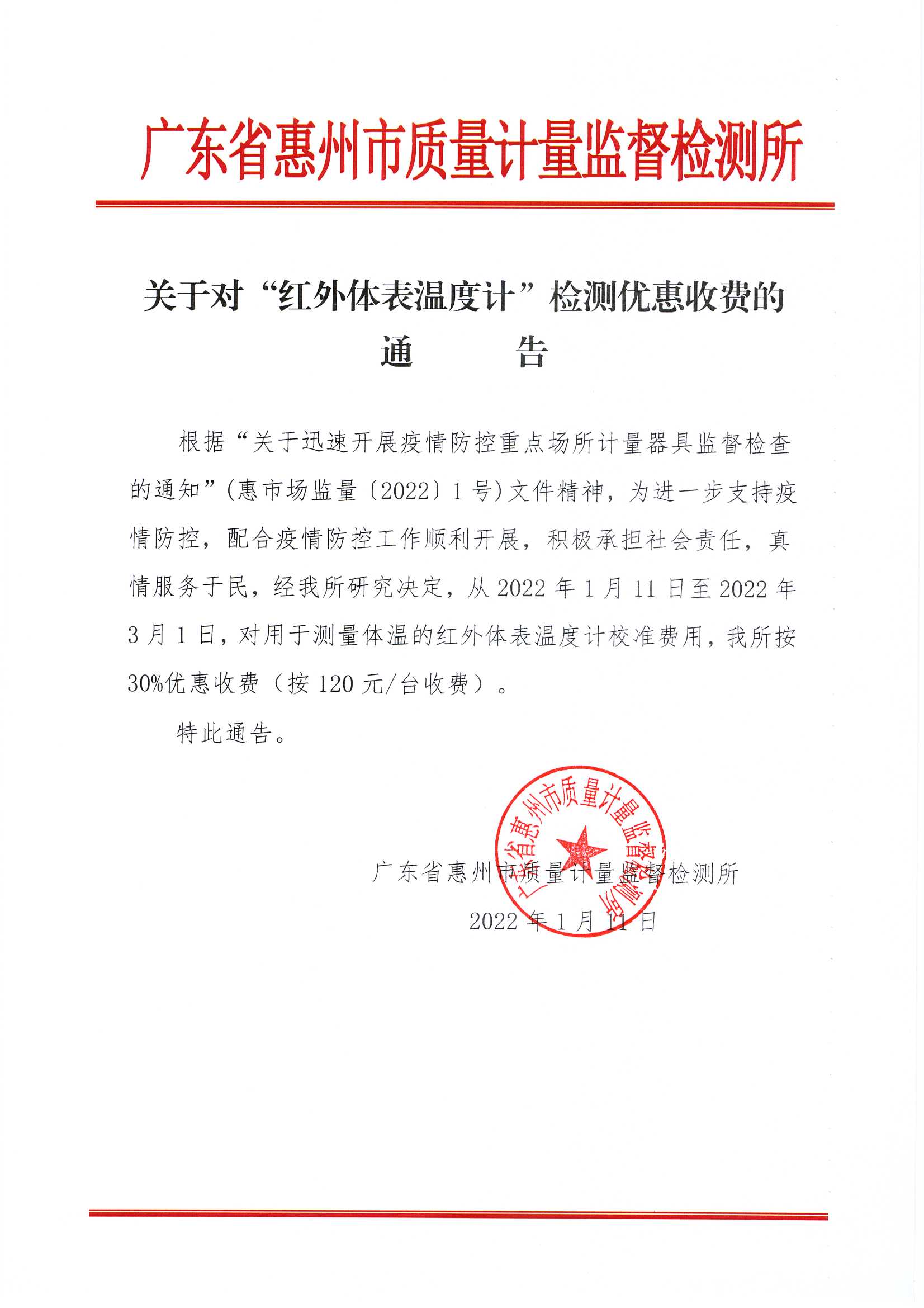关于对“红外体表温度计”检测优惠收费的通知